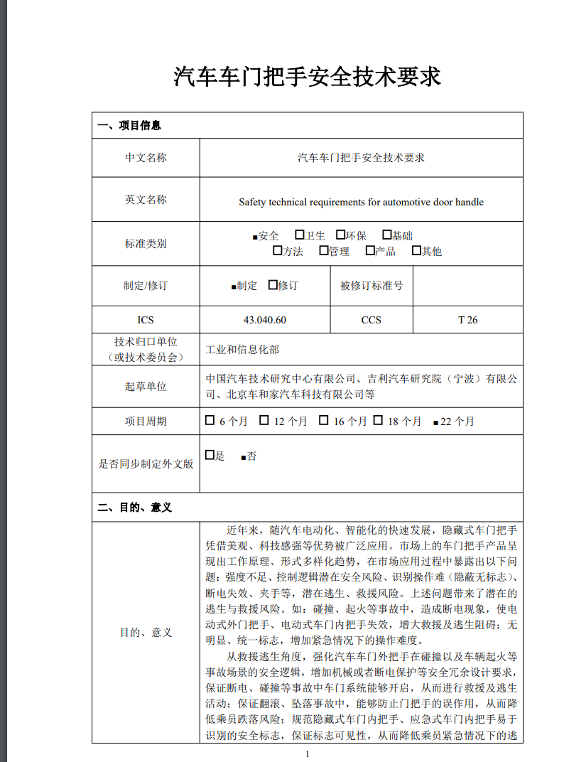 这张图片的来源是工信部官网。电动式车门外把手的部拟把手标准防夹保护与试验方法以及车门外把手上强度的要求和试验方法等方面制定关于隐藏式门把手上具体的技术要求,但几乎可以忽略不计的出台效果。例如,隐藏市场上,式门